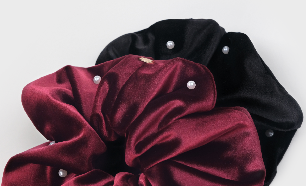This hair scrunchie is handcrafted using velvet, adorned with pearls.