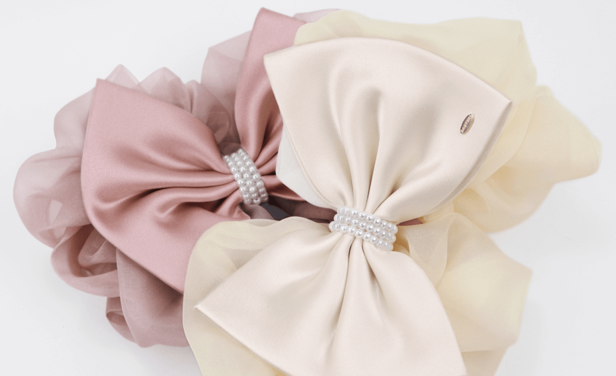 设计师选用光泽细腻的缎面布料和哑光质感的纱面布料,搭配莹润珍珠,打造日常基础发饰,呈现高级、优雅、百搭的佩戴效果。