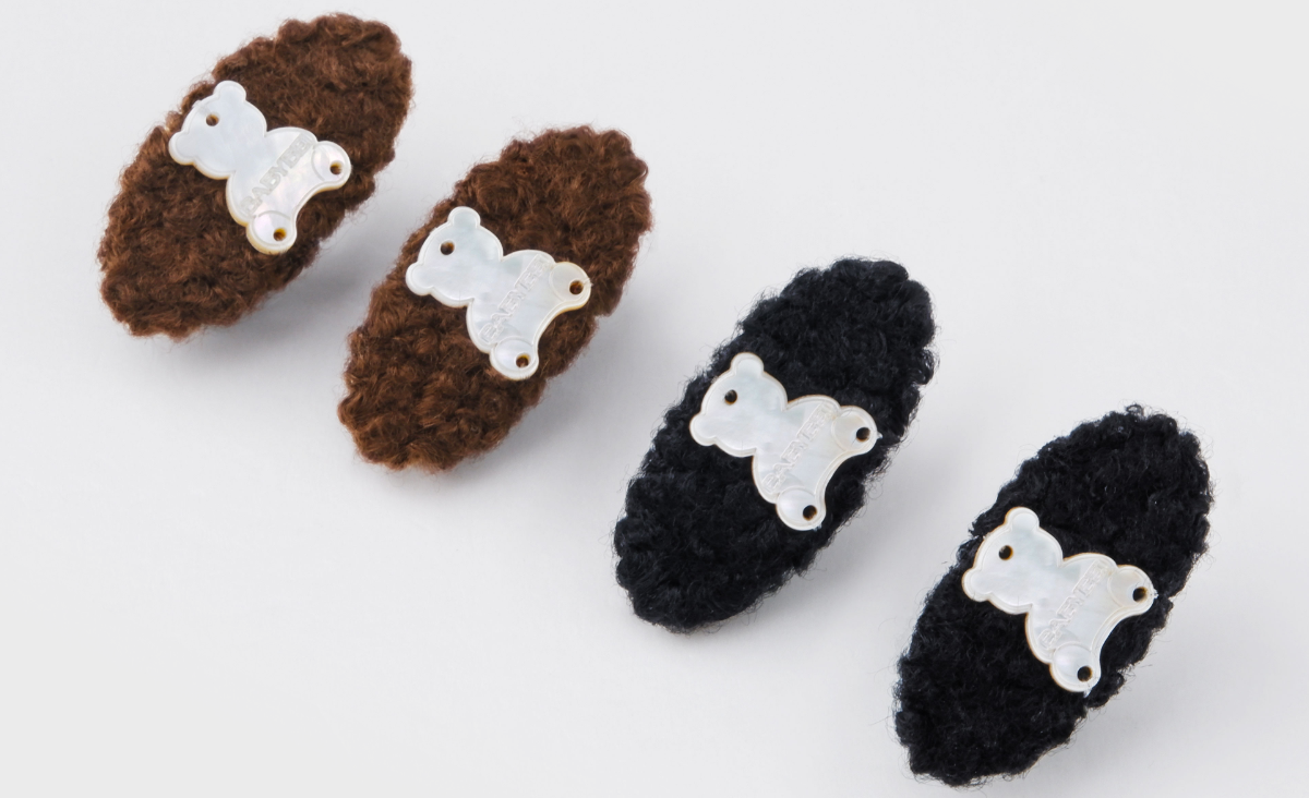设计师选用哑光质感的圈绒布料,搭配莹润母贝,打造日常基础发饰,呈现高级、优雅、百搭的佩戴效果。