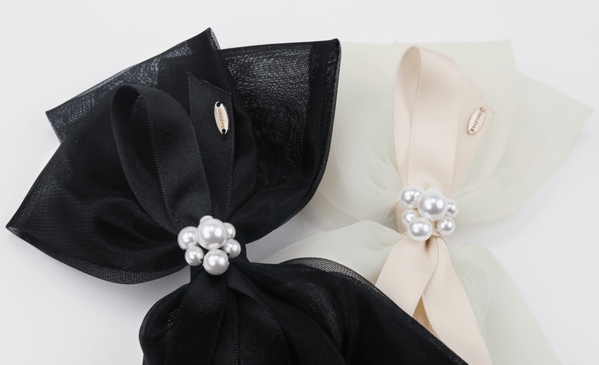 設計師選用光澤細膩的歐根紗佈料和啞光質感的織帶佈料,搭配瑩潤珍珠,打造日常基礎發飾,呈現高級、優雅、百搭的佩戴效果。