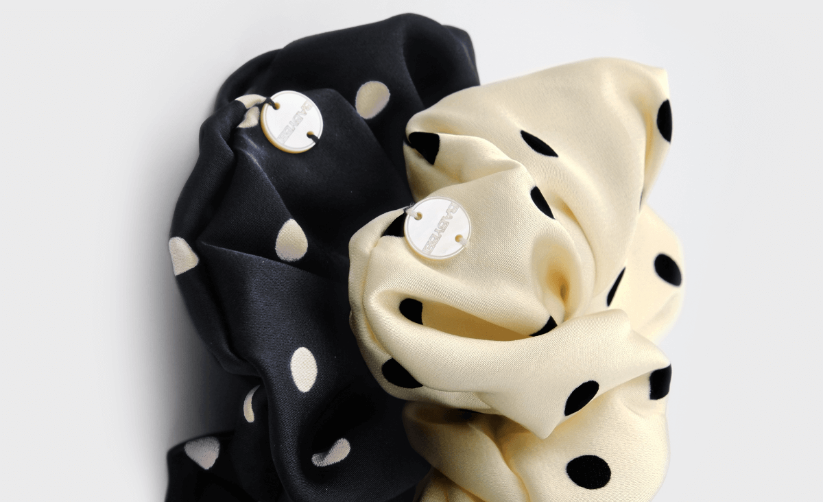 設計師選用光澤細膩的波點緞面佈料,搭配瑩潤母貝,打造日常基礎發飾,呈現高級、優雅、百搭的佩戴效果。