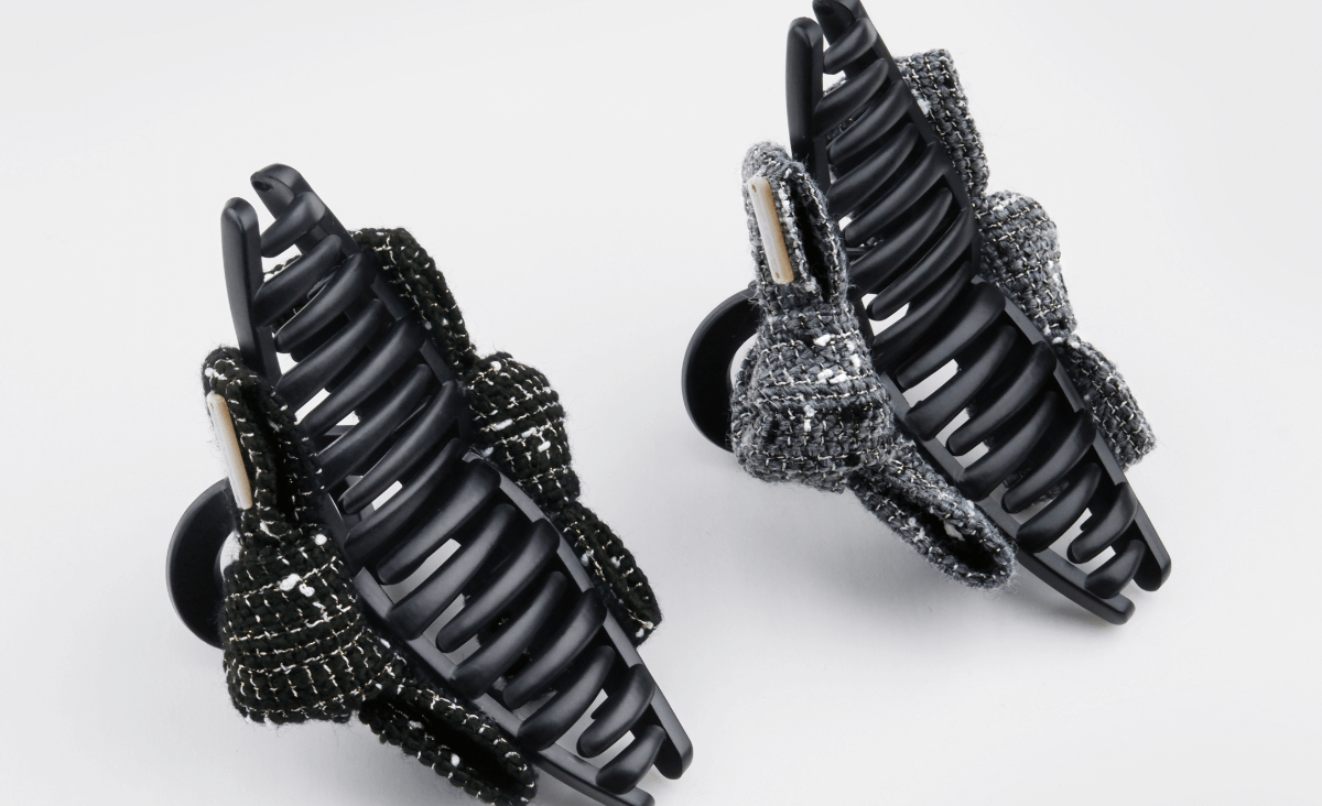 設計師選用啞光質感的粗呢佈料,搭配瑩潤母貝,打造日常基礎發飾,呈現高級、優雅、百搭的佩戴效果。